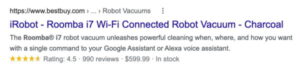 Google shows the title in blue, the URL in grey, and a description of the page. You’ll also encounter rich snippets on the SERP. A rich snippet shows extra information between the URL and the description. A rich snippet looks like this: