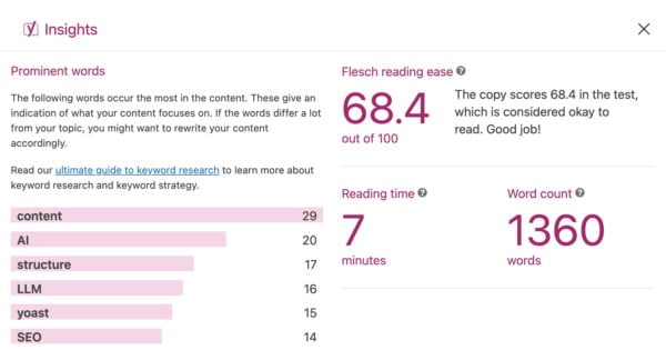 When Yoast introduced readability checks to the plugin, the Flesch reading score was one of the first tools we built in. We popularized the use of tools to score your content. It gave writers using WordPress an instant way to measure whether their content was accessible to a broad audience. You can still find the Flesch reading ease score inside the plugin today, in the insights tab.